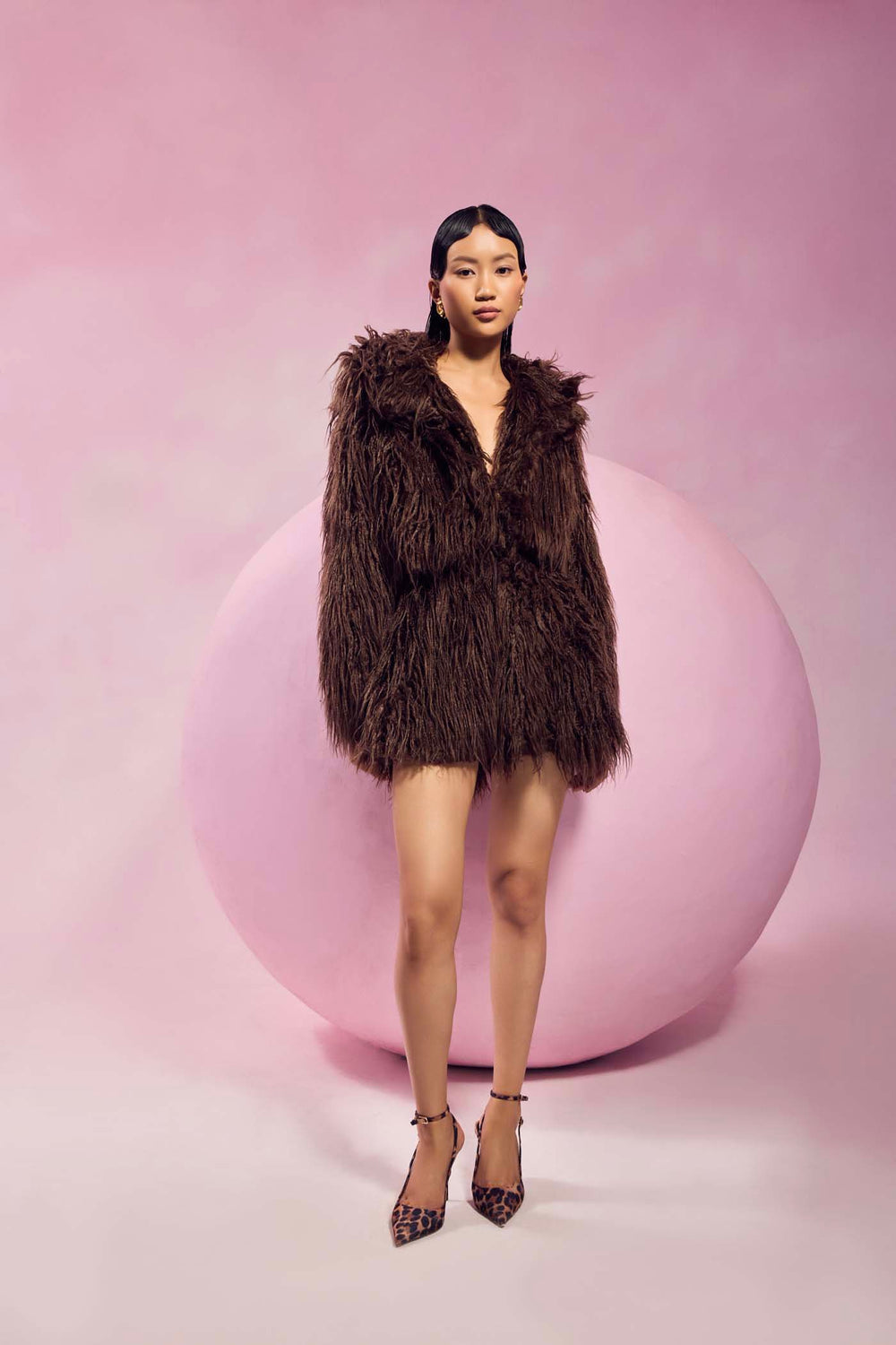 The July Issue's Nest crop jacket and skirt set is crafted from luxurious brown faux fur, combining warmth and style in one stunning ensemble. This chic pairing offers a playful yet sophisticated look that’s perfect for any occasion.