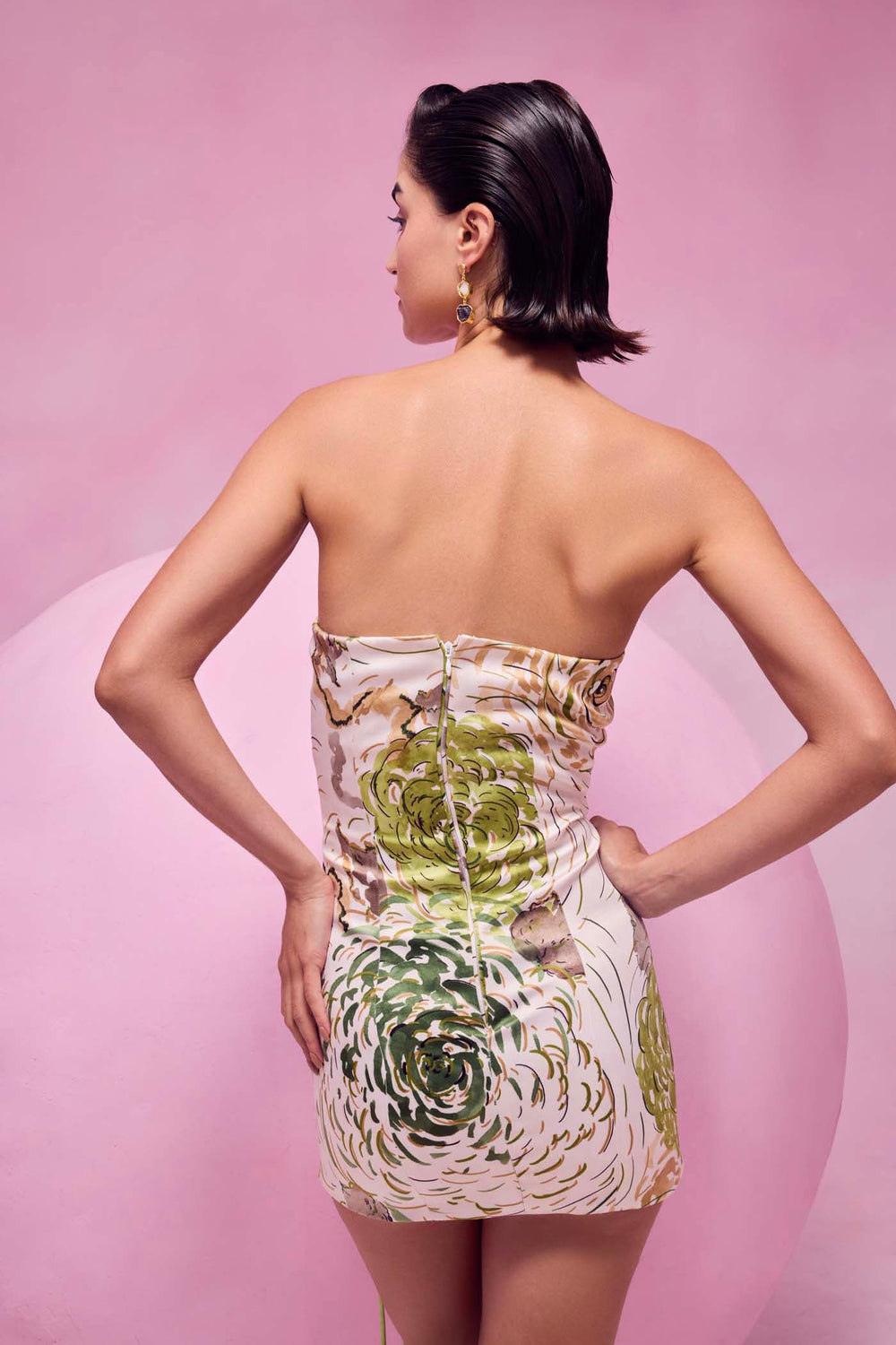 The July Issue's Verve mini dress is crafted in vibrant cotton satin fabric, featuring a bold electric lime abstract print. This eye-catching short dress showcases a striking criss-cross detail at the front, making it a standout choice for elegant outings or night events.