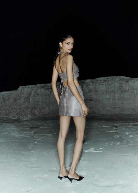 The July Issue’s Ash co-ord set is a high-impact exploration of industrial texture and precision. This striking ensemble is crafted from premium textured grey faux leather, featuring a distressed finish that captures a raw yet refined aesthetic.